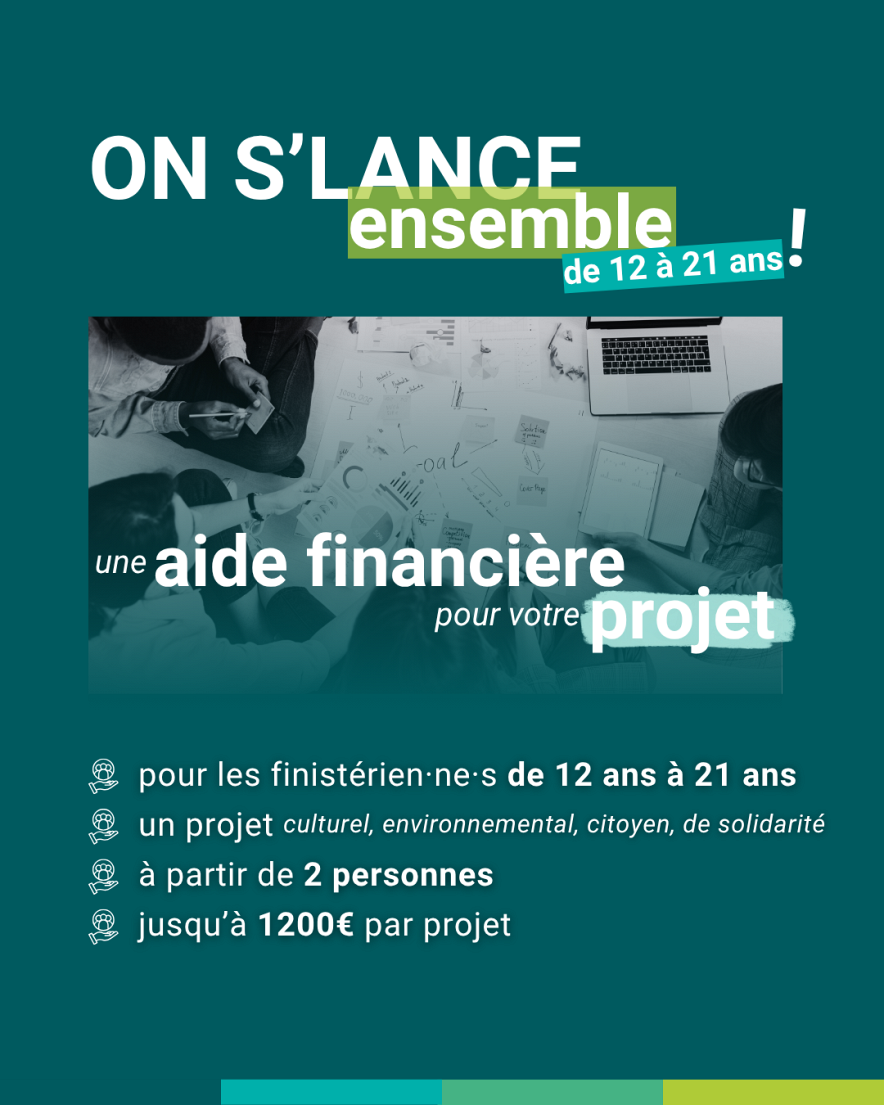 • Ensemble Pour tous les jeunes de 12-21 ans : soutenir des projets à dimension culturelle, environnementale, citoyenne ou de solidarité internationale (projet humanitaire). Une aide financière qui peut représenter jusqu’à 80% du budget, dans la limite de 1200€ . Il faut habiter le Finistère et former un groupe de deux jeunes au minimum .