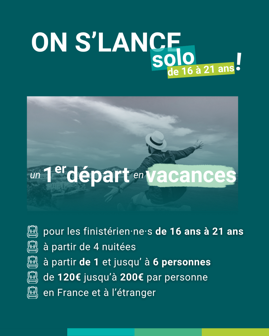 • Solo Pour tous les jeunes de 16-21 ans : aider le départ en vacances, en autonomie des jeunes, en France ou en Europe. Le séjour doit durer un minimum de 4 nuits, en solo ou par groupe de 6 jeunes maximum et se faire en autonomie . L’aide peut aller jusqu’à 250€ par personne.